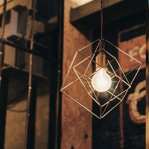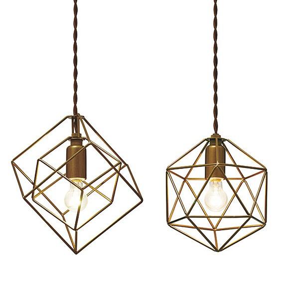 アンティークゴールド細いラインでできた多面体のランプセードがなんともレトロなイメージのペンダント照明です